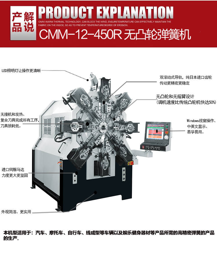 其次,永騰無凸輪彈簧機(jī)上無滾動式導(dǎo)軌,可長久保持精度。無撞機(jī)和發(fā)熱,復(fù)合刀具完成所有工序,工具損耗低。適用于汽車、摩托車、自行車、線成型等車輛以及娛樂健身器材等產(chǎn)品所需的高精密彈簧的產(chǎn)品的生產(chǎn).