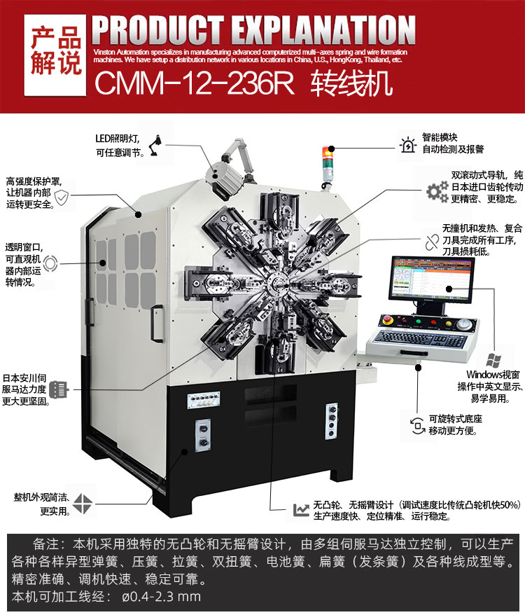 - 產(chǎn)品概述: CMM-12-236R 轉(zhuǎn)線彈簧機.可生產(chǎn)?0.4-2.3 mm線徑彈簧及線成形等)本機采用獨特的無凸輪和無搖臂設(shè)計,由多組伺服馬達獨立控制,可以生產(chǎn)各種各樣異型彈簧、壓簧、拉簧、雙扭簧、電池簧、扁簧(發(fā)條簧)及各種線成型等。精密準確、調(diào)機快速、穩(wěn)定可靠。