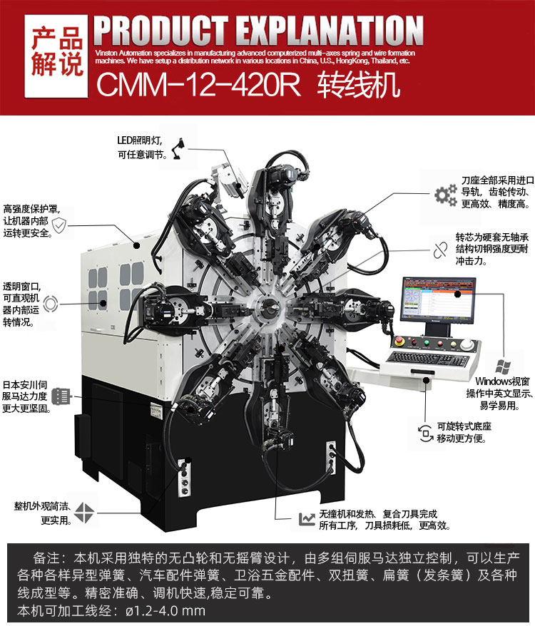 • 產(chǎn)品概述: CMM-12-420R轉(zhuǎn)線機(jī),彈簧機(jī) 可生產(chǎn)?1.2-4.0 mm線徑彈簧及線成形等)本機(jī)采用獨(dú)特的無凸輪和無搖臂設(shè)計(jì),由多組伺服馬達(dá)獨(dú)立控制,可以生產(chǎn)各種各樣異型彈簧、壓簧、拉簧、雙扭簧、電池簧、扁簧(發(fā)條簧)及各種線成型等。精密準(zhǔn)確、調(diào)機(jī)快速、穩(wěn)定可靠。(注:此款設(shè)備已停產(chǎn))