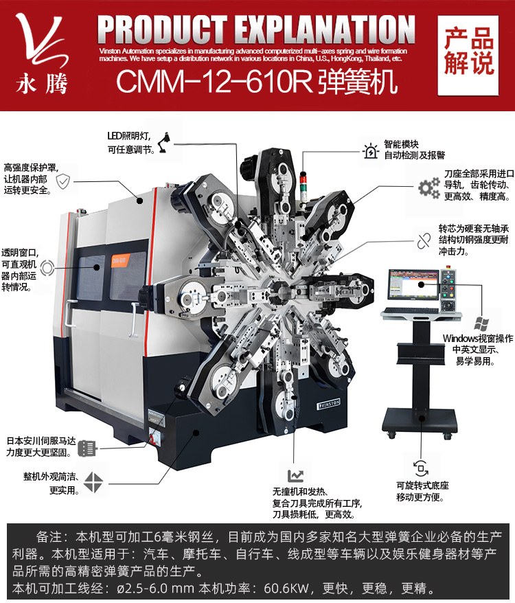 本機(jī)型適用于汽車(chē)、摩托車(chē)、自行車(chē)、線成型等車(chē)輛以及娛樂(lè)健身器材等產(chǎn)品所需的高精密彈簧產(chǎn)品的生產(chǎn)。