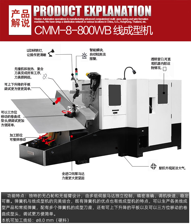 • 產(chǎn)品概述: CMM-8-800WB 線材成型機(jī)可生產(chǎn)?8mm(硬料),本機(jī)專業(yè)生產(chǎn)汽車零部件等線成型,特別適合做大桿件汽車五金線材成型產(chǎn)品帶平板的線材折彎成型機(jī),既具備精密彈簧機(jī)的精度,又超越普通線成型機(jī)的速度,生產(chǎn)汽車零部件和廚衛(wèi)五金制品以及其他日用五金制品非常適合。具有設(shè)計(jì)直觀,調(diào)試方便,速度快的亮點(diǎn)。