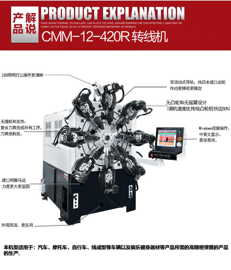 獨(dú)特的無凸輪和無搖臂設(shè)計,由多組伺服馬達(dá)獨(dú)立控制,可以生產(chǎn)各種各樣異型彈簧、壓簧、雙扭簧、電池簧、扁簧(發(fā)條簧)及各種線成型等。精密準(zhǔn)確、調(diào)機(jī)快速、穩(wěn)定可靠。